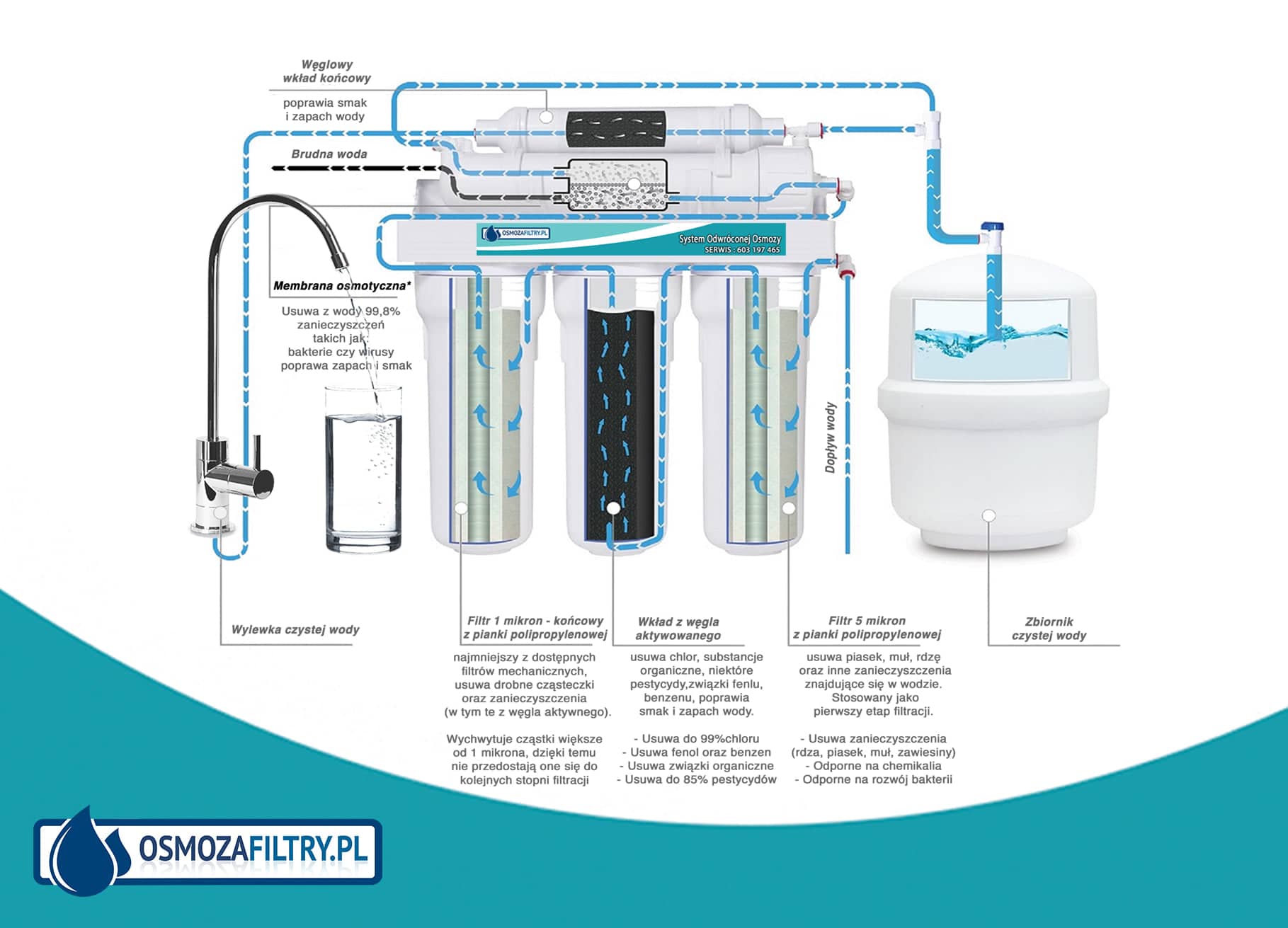 Sercem systemu jest półprzepuszczalna membrana osmotyczna, która zbudowana jest z układu cienkich błon filtrujących, zatrzymujących większość zanieczyszczeń znajdujących się w wodzie m.in.: jony wapnia, magnezu, żelaza, manganu, metali ciężkich, mikro-plastik, pierwiastki radioaktywne oraz większość bakterii i wirusów.