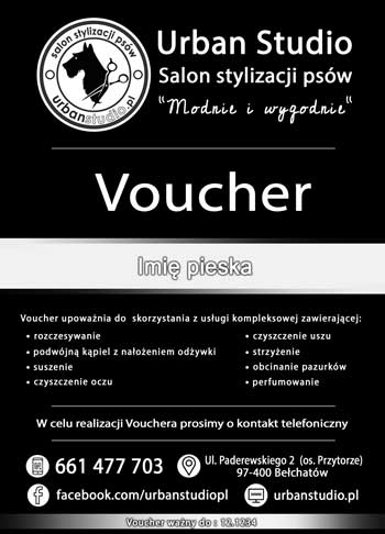 Vouchery w postaci bonu upominkowego upoważniają do skorzystania z usługi kompleksowej oferowanej przez Urban Studio (rozczesywanie, podwójna kąpiel z nałożeniem odżywki, suszenie, czyszczenie oczów i uszów, strzyżenie, obcinanie pazurków, perfumowanie).